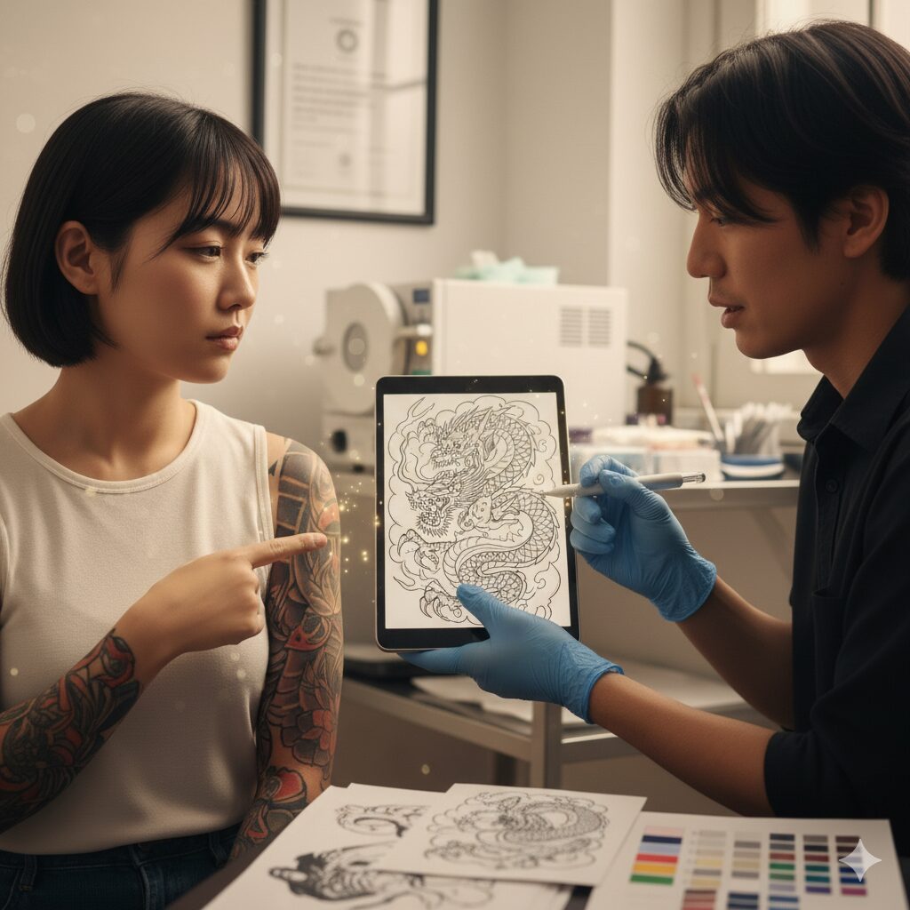 逆に、「そのデザインは部位的に見栄えが悪い」「このインクは数年後、色がぼやけやすい」など、プロとして正直に「ノー」を言えるアーティストは、真にお客様の将来を考えている証拠です。安請け合いする人よりも、厳しい意見をくれる人の方が信頼できますよね(笑)。 - パーソナルストーリーの尊重: