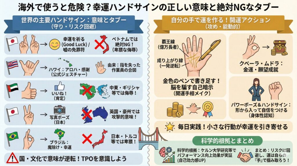 この記事では、世界中で使われている「幸運ハンドサイン」の正しい意味と、絶対にやってはいけない危険なタブーを、どこよりもわかりやすく解説します。