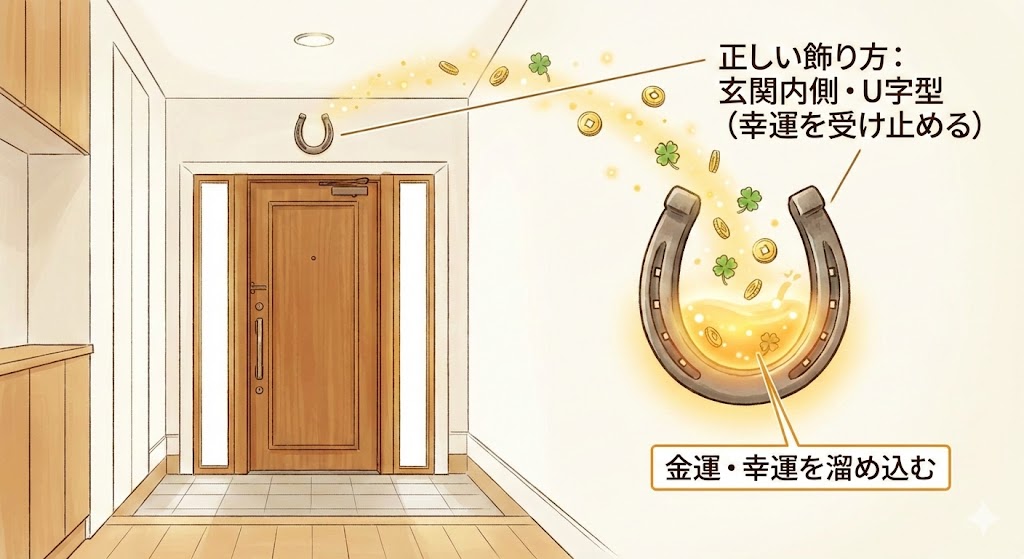 もちろん、玄関に置くインテリアやお守りとしても、金運(富)を引き寄せる作用があると考えられています。 配置する際も、一般的には上向きで幸運を招き入れ 、不運を祓いたい意図が強ければ下向きにする という、向きの意味が重要になってきますよ!