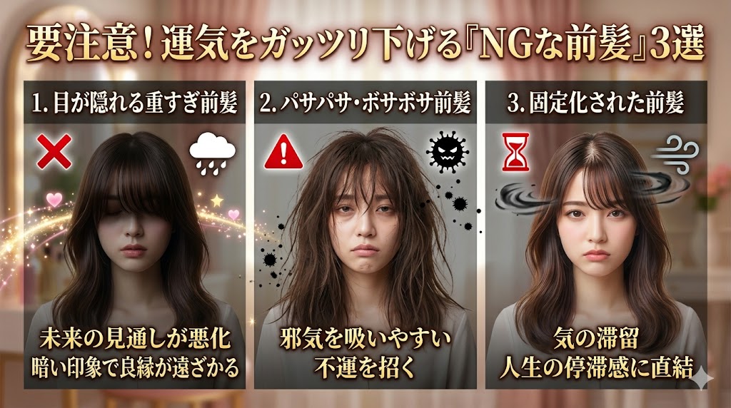良かれと思ってやっているその前髪、実は自ら運気を下げているかもしれません。以下の3つに当てはまる場合は、今すぐ改善が必要です。
