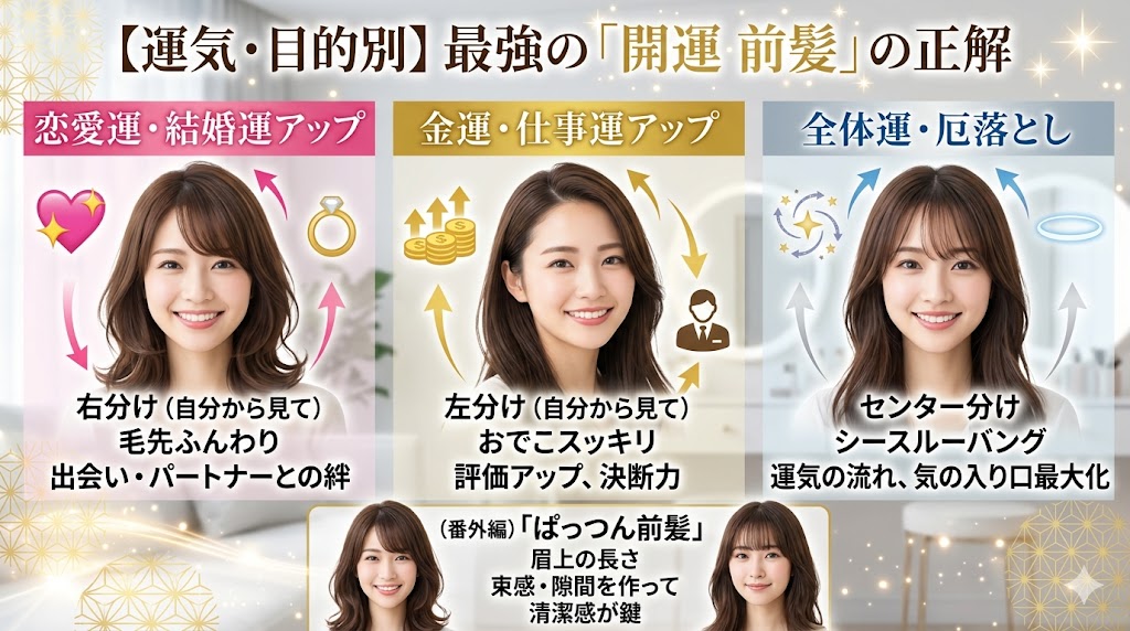 あなたが今、一番欲しい運気はどれですか?目的に合わせた最強の前髪の作り方を解説します。