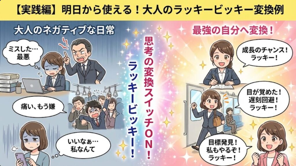 | 仕事でミスをして上司に怒られた | 「私ってダメだなぁ…落ち込む」 | 「改善点をタダで教えてもらえた!これで次は完璧になれる、成長イベント発生!ラッキービッキー!」 |