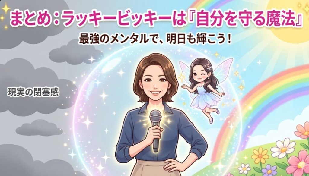 ラッキービッキーの真髄は、「本当は傷つきやすい自分」を守るために、あえて明るく振る舞う健気さにあります。「辛いなぁ」と思う自分を否定せず、「でも、とりあえずラッキーって言ってみるか」くらいの軽い気持ちで使ってみてください。