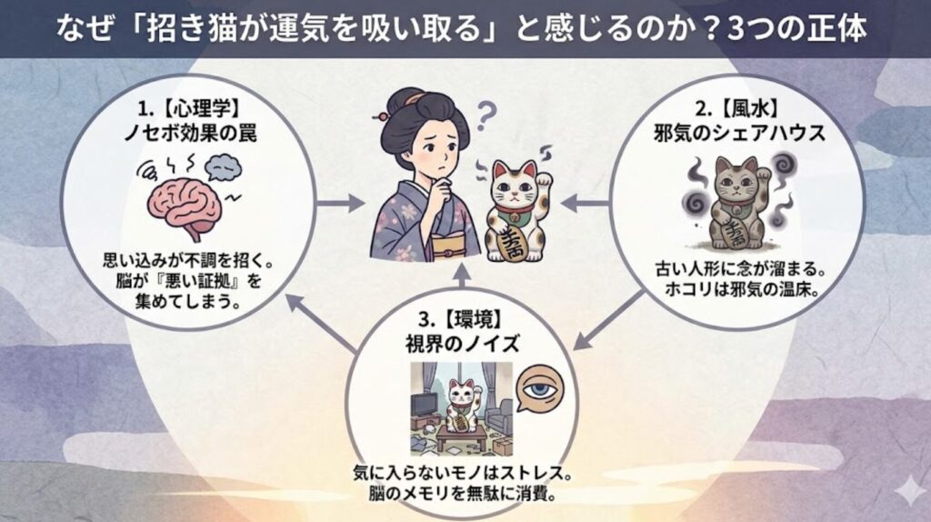 招き猫そのものが悪さをしているというより、「あなたの脳」と「環境」が化学反応を起こして不運を招いている可能性が高いのです。